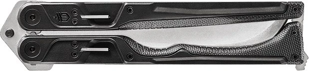 Gerber Doubledown™ Folding Machete åbnes med butterfly-åbning, hvor håndtaget låses forsvarligt med låsetangent i både udslået og sammenfoldet tilstand. Det patenterede Quad Lock™ System med det indbyggede sikkerhedsstop opererer med tre forskellige låsepositioner under åbning og sikrer en sikker og intuitiv betjening, hvor fingrene ikke kommer i karambolage med klingen, når kniven åbnes.