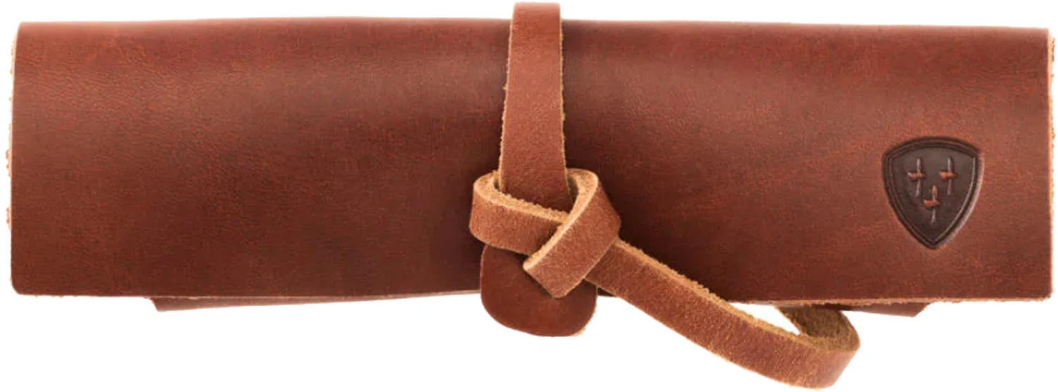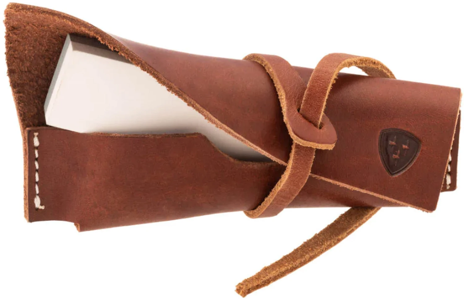 Slibestenen måler 115 x 30 x 15 mm. og leveres i en smuk, håndlavet og praktisk læderskede til sikker og stilfuld opbevaring.